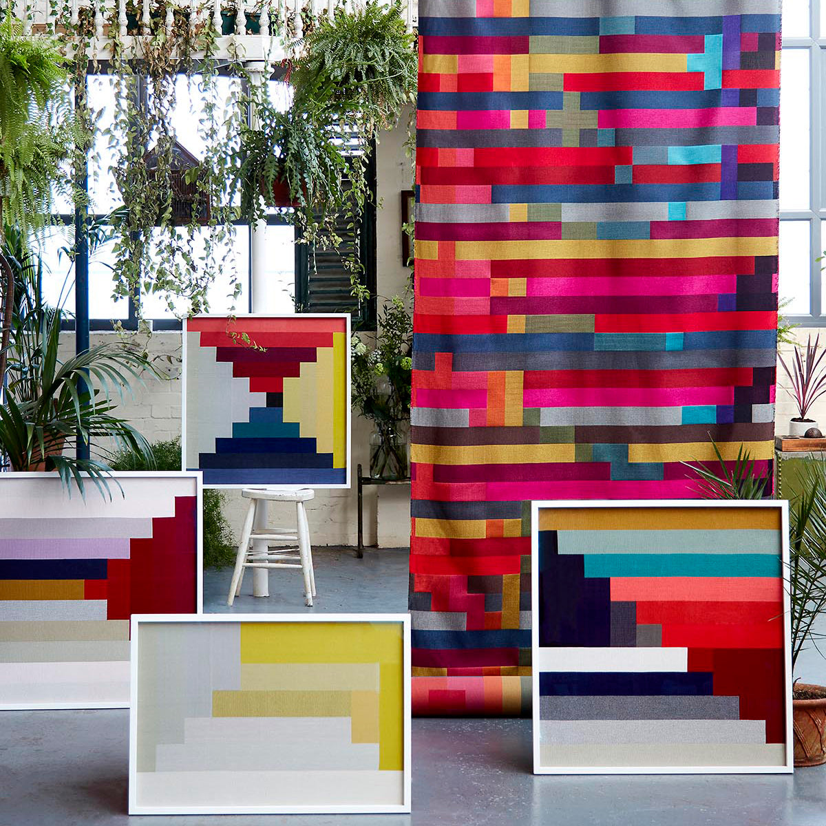 Assembly explores how colour and structure interact, within a regular framework, to create abstract interlocking compositions. This design came directly out of Margo’s handwoven artworks, and the fabric construction is based on the Lampas handweaving technique – Assembly exemplifies the studio’s approach of Art-into-Industry.