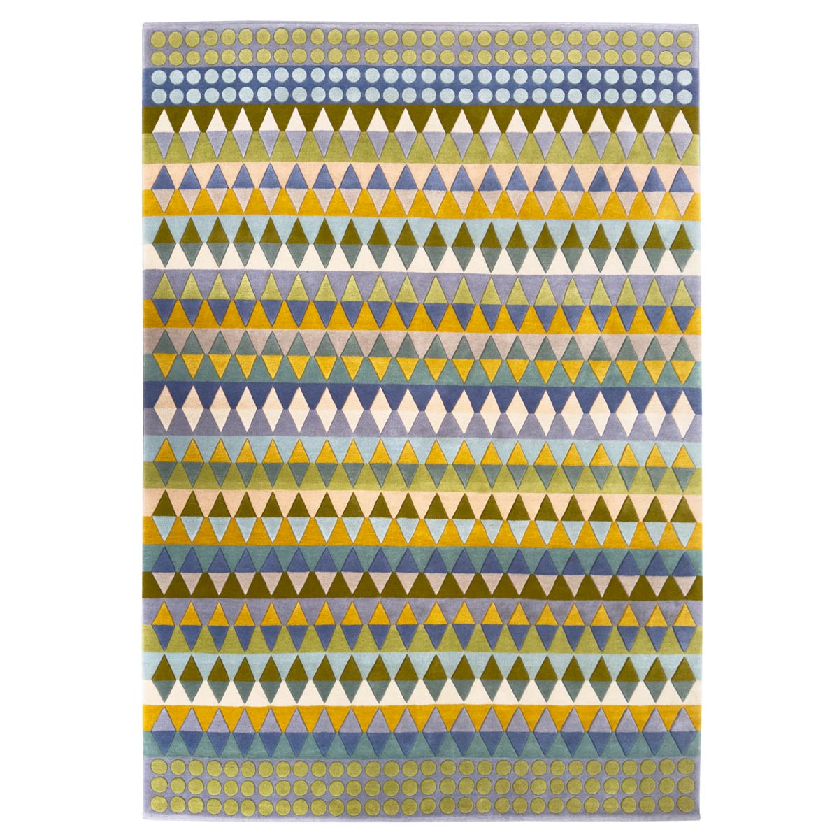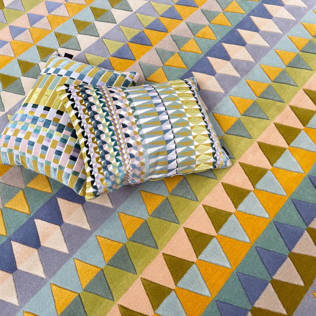 Split diamond motifs and spots create a crisp composition, while the colour palette harmoniously balances warm, grounding tones with bright, uplifting hues.