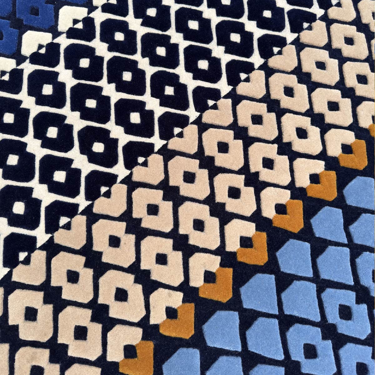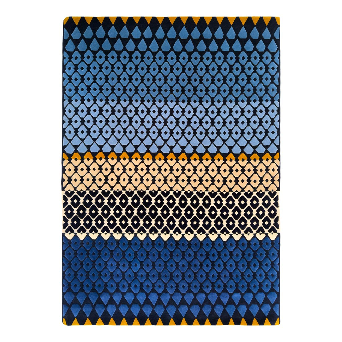 The Chartwell rug is inspired by the forms of cut glass. The geometric pattern is realised in deep navy and layered blues, with a pop of mustard.