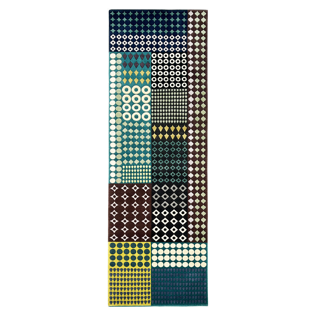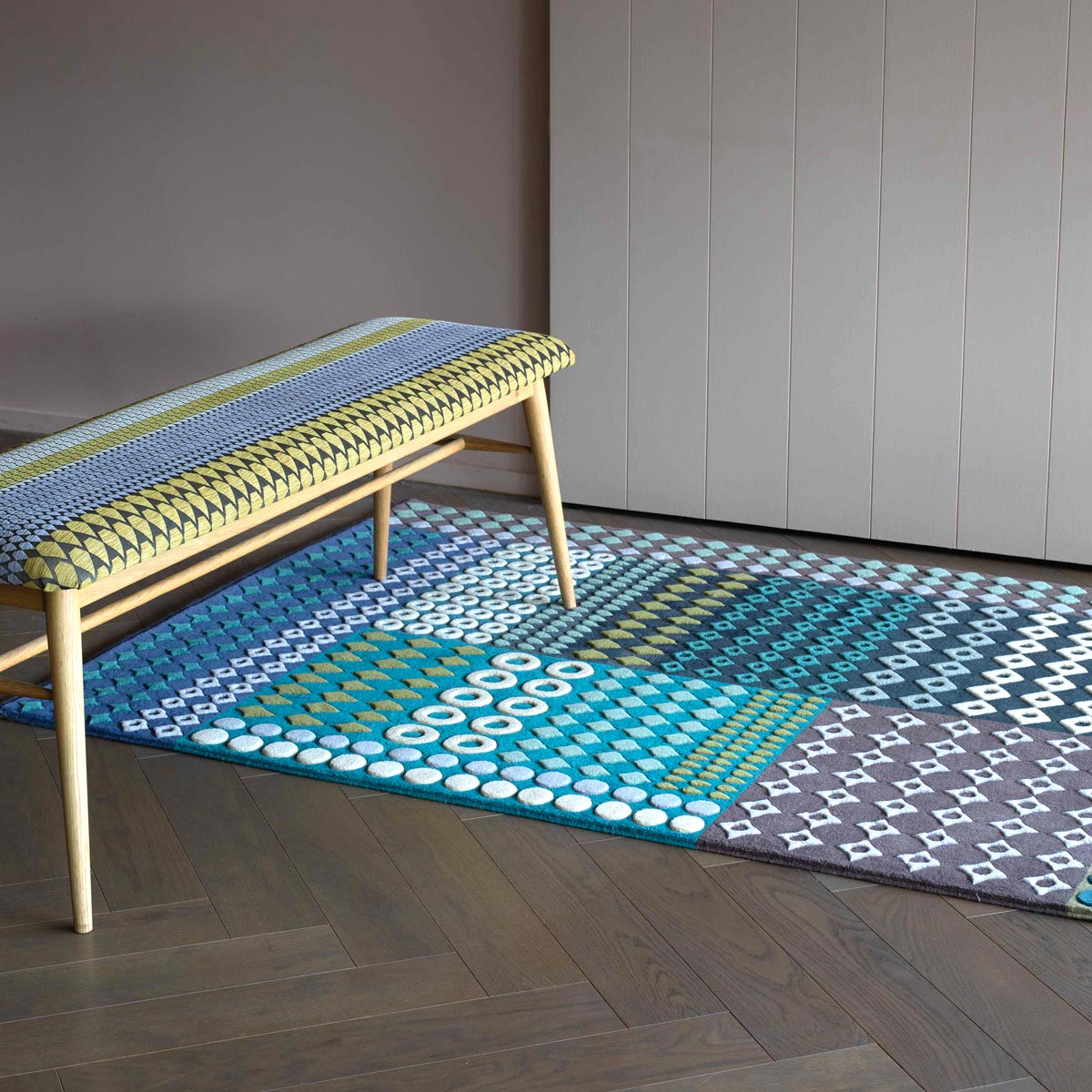 The Clarens rug features intersecting patterns in an asymmetric grid - inspired by Indian architectural carving and mosaic tiles. The colour palette moves from blue to green, with accents of gold